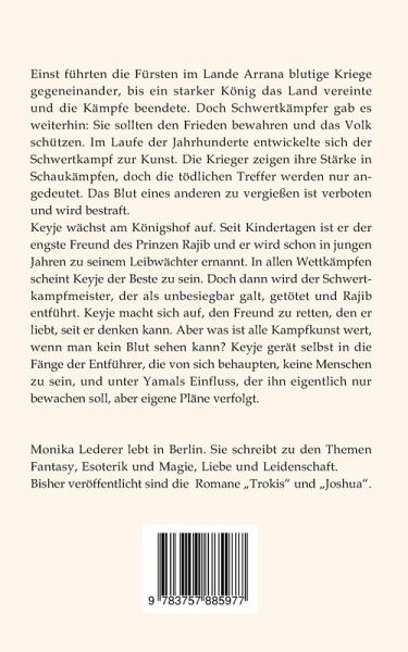 Einst führten die Fürsten im Lande Arrana blutige Kriege gegeneinander, bis ein starker König das Land vereinte. Doch Schwertkämpfer gab es weiterhin: Sie sollten den Frieden bewahren und das Volk schützen. Im Laufe der Jahrhunderte entwickelte sich der Schwertkampf zur Kunst. Die Krieger zeigen ihre Stärke in Schaukämpfen, doch die tödlichen Treffer werden nur angedeutet. Das Blut eines anderen zu vergießen ist verboten und wird bestraft.Keyje wächst am Königshof auf. Seit Kindertagen ist er der engste Freund des Prinzen Rajib, er wird schon in jungen Jahren zu seinem Leibwächter ernannt. In allen Wettkämpfen scheint Keyje der Beste zu sein. Doch dann wird der Schwertkampfmeister, der als unbesiegbar galt, getötet und Rajib entführt. Keyje macht sich auf, den Freund zu retten, den er liebt, seit er denken kann. Aber was ist alle Kampfkunst wert, wenn man kein Blut sehen kann? Keyje gerät selbst in die Fänge der Entführer, die von sich behaupten, keine Menschen zu sein, und unterYamals Einfluss, der ihn eigentlich nur bewachen soll, aber eigene Pläne verfolgt.