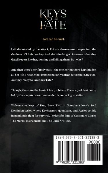 Fate can be cruel. Left devastated by the attack, Erica is thrown ever deeper into the shadows of Limbo society. And she is in danger. Someone is hunting GateKeepers like her, hunting and killing them. And then there's her family past - the one her mother's kept hidden all her life. The one that impacts not only Erica's future but Guy's too. Are they ready to face their Fate? Though, that is the least of her problems. The army of Lost Souls, led by their mysterious commander, is preparing to strike. Can she and Michael put their differences aside in time to save mankind? Welcome to Keys of Fate, Book Two in Georgiana Kent's Soul Dominion series, where KeyMasters, quondams, and Færies collide in mankind's fight for survival. Perfect for fans of Cassandra Clare's The Mortal Instruments and The Dark Artifices. (This is the second part of a trilogy - one story over three books - and not a standalone)
