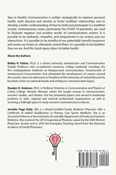 Keys to Healthy Communication is written strategically to improved personal physical and mental health, to foster healthier relationships and to develop a better understanding of how to build and participate in a healthier society. Contemporary issues, such as the COVID-19 pandemic, are used to illustrate negative and positive results of communication actions. It is possible to be authentic, empathic, and empowered in our actions and our interactions. It is possible to be mindful of our potentially harmful responses and rewire our brains to ultimately control them. It is possible to be healthier than we are. And this book opens doors to better health. The human brain is the central organ that affects and is affected by states of health. We follow the evolution of the human brain with particular attention to the fight/flight/freeze reaction. Due to the automatic survival system built into our brains, the ability to communicate in healthy ways diminishes when we feel threatened or stressed. So, when our survival instincts take over, we citizens of the 21st century are each capable of reacting as Neanderthals. Neuroscientific discoveries provide the basis for understanding and controlling harmful responses. The absence of authenticity harms all facets of our lives. For the individual, a lack of self-awareness leads to many psychological and emotional problems. Authenticity demands that we be realistic, neither naively hopeful nor overly self-critical. Fear of people seeing the "real me" can cause me to "just put on an act," pretending to be someone at odds with my true inner feelings or beliefs. Relationships develop according to the degree of authenticity reciprocated between parties. Inauthenticity leads to manipulation, game-playing, deception, disappointments, and even abuse. Appropriate self-disclosure is a sign of good mental health, and results in greater competency, adaptability, and trust. Deceptions, scams, and untruths have led to a decline of trust in our society. Our perception of reality has been victimized, and trust diminished. Different versions of "reality" result in allegations of "fake news" and distort how people see the world and respond to it. Trust is necessary for our democracy to function and the world as we know it to survive. Empathy is the act of understanding thoughts and feelings of another individual. The empathic response allows the needs of both communicators to be met. Physical and mental health are related to the presence and use of empathy. Empathy is a necessary component of a healthy relationship. For a healthy society, the use of empathy includes taking on the experiences of people and cultures with whom we don't necessarily find identity or agreement. Such understanding increases the likelihood of better decision making. Empowerment involves accepting and utilizing our own inherent power in all situations. This means questioning self-imposed limits, refusing to identify external forces as the determiner of actions, and exercising our abilities to self-regulate. It is possible to help others recognize their own power in controlling their own lives. Each of us is responsible for controlling our own behaviors and destinies. This book provides exercises and practices that promote opportunities to develo