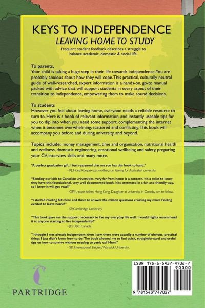 Addressing the gap between life at home with all its comforts and that of an independent adult, Keys to Independence takes a critical-thinking approach to help young adults not just survive but also to thrive on their route to independence. This is a collaborative project among three parents, also educators, who share the motivation to prepare students for life challenges. This book offers a practical guide for both students and parents. It offers well-researched information to enhance discernment and sound decision-making, and it gives tips on basic skills like money management, reading food labels, cooking balanced meals, staying organized, domestic engineering, getting a job, and more. Packed with culturally neutral information to reinforce those expanding life skills, as well as lists of handy tips and tricks, Keys to Independence provides the tool kit necessary to help keep university, and the years beyond, enriched with positive experiences. It empowers students during the transition from home and school to university and independence.