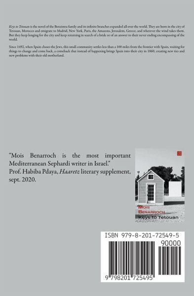 "Mois Benarroch is the most important Mediterranean Sephardi writer in Israel." Prof. Habiba Pdaya, Haaretz literary supplement, sept. 2020. Keys to Tetouan is the novel of the Benzimra family and its infinite branches expanded all over the world. They are born in the city of Tetouan, Morocco and emigrate to Madrid, New York, Paris, the Amazons, Jerusalem, Greece, and wherever the wind takes them. But they keep longing for the city and keep returning in search of a bride or of an answer to their never ending encompassing of the world. Since 1492, when Spain chases the Jews, this small community settles less than a 100 miles from the frontier with Spain, waiting for things to change and come back, a comeback that instead of happening brings Spain into their city in 1860, creating new ties and new problems with their old motherland.