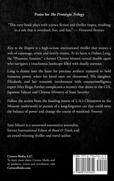 The third and final book in The Prototype Trilogy from former Road & Track editor Sam Mitani, Keys to the Empire is a high-octane international thriller that weaves a web of espionage, crime and family drama. At its heart is Dalton Lang, the "Phantom Assassin," a former Chinese hitman turned double agent who navigates a treacherous landscape filled with deadly enemies and hidden motives. Lang is drawn into the hunt to recover precious artifacts rumored to hold immense power, when his loved ones are threatened. His daughter, Elizabeth, and her romantic involvement with counterintelligence expert Max Koga, further complicates a mystery that draws in factions from the CIA, the Japanese Yakuza and the Chinese Ministry of State Security - among others. Follow Lang from the bustling streets of L.A.'s Chinatown to the serene settings of an abandoned winery as he teams up with former allies, confronts old enemies and faces new threats marked by intense combat, tactical maneuvers, and a constant struggle to stay one step ahead. This gripping tale blends action, espionage, and personal drama with a protagonist who is as skilled with a gun as he is tormented by inner demons. Published by Carrara Media.