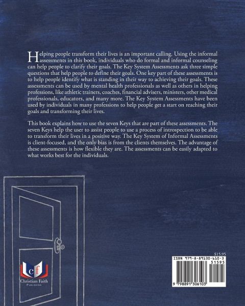 Helping people transform their lives is an important calling. Using the informal assessments in this book, individuals who do formal and informal counseling can help people to clarify their goals. The Key System Assessments ask three simple questions that help people to define their goals. One key part of these assessments is to help people identify what is standing in their way to achieving their goals. These assessments can be used by mental health professionals as well as others in helping professions, like athletic trainers, coaches, financial advisers, ministers, other medical professionals, educators, and many more. The Key System Assessments have been used by individuals in many professions to help people get a start on reaching their goals and transforming their lives. This book explains how to use the seven Keys that are part of these assessments. The seven Keys help the user to assist people to use a process of introspection to be able to transform their lives in a positive way. The Key System of Informal Assessments is client-focused, and the only bias is from the clients themselves. The advantage of these assessments is how flexible they are. The assessments can be easily adapted to what works best for the individuals.