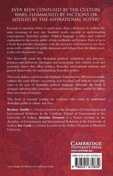 Keywords in Australian Politics is much more than a dictionary. It outlines the main meanings of over one hundred words essential to understanding contemporary Australian politics. Political language is often used without explanation in the media, public debate, textbooks and lectures. Here at last is a book that provides Australians with the necessary information to use these terms with confidence in public discussion and debate, from the dinner party to the end-of-semester essay. This book defines each keyword, highlights links between different keywords, outlines the main debates concerning each keyword and indicates how they came to be part of Australian political language. Although the book is arranged alphabetically, systematic cross-referencing allows readers to follow their own trails of enquiry. This book is essential reading for everyone who wants to understand Australian political culture and ideas.