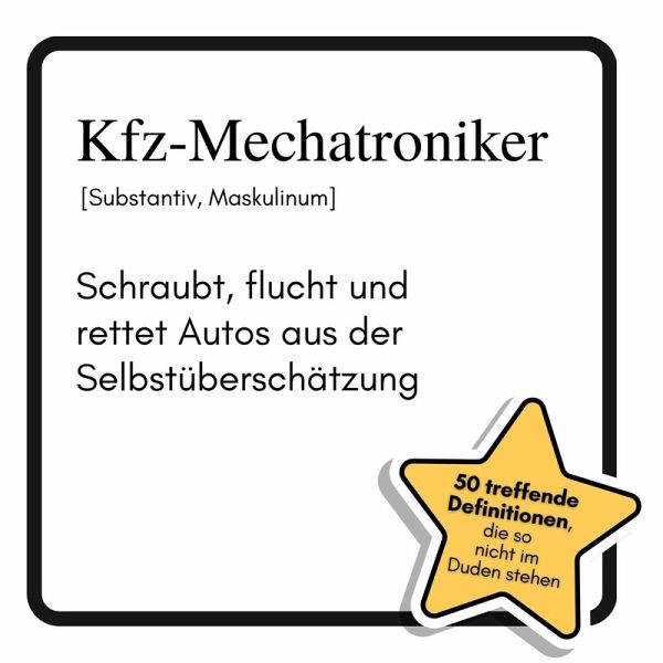 Wenn der Schlagschrauber lauter flucht als der Mechaniker und die Check-Engine-Lampe zum Running Gag wird, ist klar: Hier wird nicht nur geschraubt, sondern auch gelacht! "Kfz-Mechatroniker: Schraubt, flucht und rettet Autos aus der Selbstüberschätzung" bringt den Werkstattalltag auf den Punkt - mit 50 witzigen Definitionen und Illustrationen, die zeigen, warum Kfz-Profis wahre Alltagshelden sind.Für wen dieses Buch perfekt ist:- Für alle, die Autos lieben und Werkstatt-Humor schätzen- Für Kfz-Mechatroniker, Azubis und Schrauber mit Selbstironie- Für Freunde, Kollegen und Familien, die das Werkstattleben kennenOb Hebebühne, Werkstattkaffee oder Tüv-Prüfer - jede Seite trifft ins Schwarze. Ein Geschenk, das in keiner Werkstatt fehlen darf und garantiert für Lacher sorgt.Was dieses Buch bietet:- 50 humorvolle Definitionen aus dem Kfz-Alltag- Passende Illustrationen zu jedem Begriff- Werkstatthumor für jede Gelegenheit- Das ideale Geschenk für Schrauber und Autoliebhaber