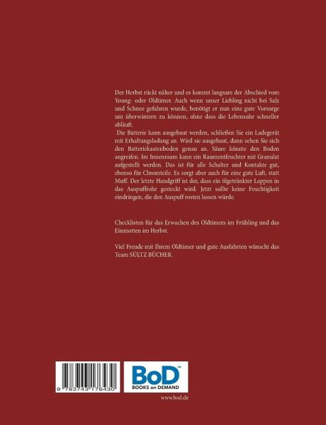 Der Herbst rückt näher und es kommt langsam der Abschied vom Young- oder Oldtimer. Auch wenn unser Liebling nicht bei Salz und Schnee gefahren wurde, benötigt er nun eine gute Vorsorge, um überwintern zu können, ohne dass die Lebensuhr schneller abläuft. Natürlich kann nicht jedes Fahrzeug einen perfekten Unterstellplatz haben, was natürlich wünschenswert wäre, aber unter freiem Himmel sollte es nicht sein. Beginnen wir mit der Dokumentation des Zustandes. Gibt es eine neue Delle oder Rostblase? Entscheiden Sie selbst, wann Sie diese Probleme beseitigen wollen. Um zu überwintern, reicht es bei einem Rostfleck auch, wenn kurz angeschmirgelt wird und dann Rostschutz oder Fett aufgetragen wird. Arbeiten Sie die Checklisten hier im Buch gründlich ab. Gründlich sollte auch die Wagenwäsche sein, auch der Unterboden. Bei der Innenreinigung können nach dem letzten Aussteigen die Ledersitze gepflegt werden. Übrigens wird der Oldtimer oder Youngtimer nicht sofort nach der Wagenwäsche für Monate abgestellt werden. Drehen Sie noch eine Runde, bringen Sie das gute Stück noch einmal auf Betriebstemperatur, so wird er richtig trocken und auch Kondenswasser verdampft im Auspuff. Denken Sie auch an den Ölwechsel, auch wenn er nicht fällig ist. Im gebrauchten Öl bilden sich aggressive Säuren, die greifen Metallteile und Dichtungen an. Wer seinen Wagen nicht aufbocken kann, erhöht den Reifendruck auf bis zu 3,8 bar. So entstehen keine Standplatten. Bemerken Sie doch in der neuen Saison mit korrekt eingestelltem Luftdruck ein leichtes Ruckeln im Lenkrad, fahren Sie 50 km, danach müsste es wieder in Ordnung sein. Die Batterie kann ausgebaut werden, schließen Sie ein Ladegerät mit Erhaltungsladung an. Wird sie ausgebaut, dann sehen Sie sich den Batteriekastenboden genau an. Säure könnte den Boden angreifen. Im Innenraum kann ein Raumentfeuchter mit Granulat aufgestellt werden. Das ist für alle Schalter und Kontakte gut, ebenso für Chromteile. Es sorgt aber auch für eine gute Luft, statt Muff. Der letzte Handgriff ist der, dass ein ölgetränkter Lappen in das Auspuffrohr gesteckt wird. Jetzt sollte keine Feuchtigkeit eindringen, die den Auspuff rosten lassen würde.