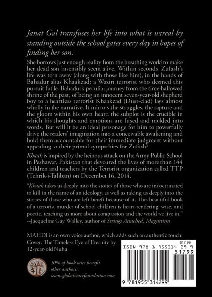 Mahdi is an own voice author, whose sole purpose is to shed light on the quintessential aspects of duality and oneness in all that exists. That adds such an authentic touch to Khaak; a moving story, based on true events entailing the attack on the Army Public School in Peshawar, Pakistan that devoured the lives of more than 144 children and teachers by the alleged Terrorist organization called TTP (Tehrik-i-Taliban) on December 16, 2014. To pen this tale of sorrow and cruelty became more of a conscious decision for Mahdi; to re-create a story-world that didn't necessarily begin with screams and end in silence, but roared with the "love" of a mother and the earth shattering spirit of a valiant seven year old, declaring and honouring a growing presence, the presence of a message that has not been said, but which is very much there. The message in Khaak does not intend to present things through the cold-eyed lens of factuality, rather it encourages the readers to listen to the voice, of unexpressed feelings and emotions and give a real wrought out design of Zufash's and Janat Gul's message; about the spirit of unconditional love, about rising again from the ashes, about the future, as it flourishes under the mantle of books and childhood galore."MAHDI is my conscious choice as it resonates with my soul purpose. MAHDI means guidance, it means, voice against injustice, it means a higher consciousness that transcends the boundaries of limitations, pain, suffering and transforms all into growth, love and light!! MAHDI is sheer alchemy of the soul." Indeed, Khaak's message is the same just as the essence of the name Mahdi, to transcend the suffering and pain, to become one with the collective energy of love and healing, to make conscious choices for a better earth for us and our children, to simply exist in peace and harmony with all that is called "life!" Mahdi and Khaak resonate that Oneness, of purpose.