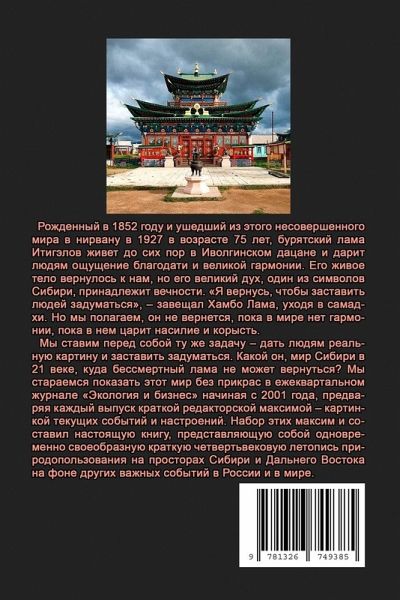 АНАТОЛИЙ ЛЕБЕДЕВ ХАМБО ЛАМА НЕ ВЕРНЕТСЯ Сибирские максимы 21 века Рожденный в 1852 году и ушедший из этого несовершенного мира в нирвану в 1927 в возрасте 75 лет, бурятский лама Итигэлов живет до сих пор в Иволгинском дацане и дарит людям ощущение благодати и великой гармонии. Его живое тело вернулось к нам, но его великий дух, один из символов Сибири, принадлежит вечности. Я вернусь, чтобы заставить людей задуматься, - завещал Хамбо Лама, уходя в самадхи. Но мы полагаем, он не вернется, пока в мире нет гармонии, пока в нем царит насилие и корысть. Мы ставим перед собой ту же задачу - дать людям реальную картину и заставить задуматься. Какой он, мир Сибири в 21 веке, куда бессмертный лама не может вернуться? Мы стараемся показать этот мир без прикрас в ежеквартальном журнале Экология и бизнес начиная с 2001 года, предваряя каждый выпуск краткой редакторской максимой - картинкой текущих событий и настроений. Набор этих максим и составил настоящую книгу, представляющую собой одновременно своеобразную краткую четвертьвековую летопись природопользования на просторах Сибири и Дальнего Востока на фоне других важных событий в России и в мире. [CODE-ART]