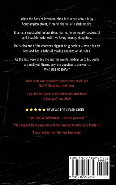 When the body of Inzamam Khan is dumped onto a busy Southampton street, it marks the fall of a dark empire. Khan is a successful restaurateur, married to an equally successful and beautiful wife, with two loving teenage daughters. He is also one of the country's biggest drug dealers who rules by fear and has a habit of making enemies on all sides. As the last week of his life and the events leading up to his death are replayed - there's only one question to answer... WHO KILLED KHAN ? Khan is the eagerly awaited second crime novel from FIVE STAR author, Heath Gunn. If you like fast paced crime fiction, with dark forces at play, you'll love Khan!