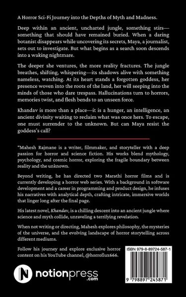 A Horror Sci-Fi Journey into the Depths of Myth and Madness Deep within an ancient, uncharted jungle, something stirs-something that should have remained buried. When a daring botanist disappears while uncovering its secrets, Maya, a journalist, sets out to investigate. But what begins as a search soon descends into a waking nightmare. The deeper she ventures, the more reality fractures. The jungle breathes, shifting, whispering-its shadows alive with something nameless, watching. At its heart stands a forgotten goddess, her presence woven into the roots of the land, her will seeping into the minds of those who dare trespass. Hallucinations turn to horrors, memories twist, and flesh bends to an unseen force. Khandav is more than a place-it is a hunger, an intelligence, an ancient divinity waiting to reclaim what was once hers. To escape, one must surrender to the unknown. But can Maya resist the goddess's call?