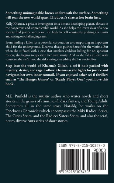 Something unimaginable brews underneath the surface. Something will tear the new world apart. If it doesn't shatter her brain first. Kelly Kharma, a private investigator on a distant developing planet, thrives in the dangerous and unpredictable world. As she helps the lower-class of a new society find justice and peace, she finds herself constantly pushing the limits and taking on challenging cases. From finding a killer for a powerful corporation to transporting an important child for the underground, Kharma always pushes herself for the victims. But when she is faced with a case that involves children killing for no apparent reason, she begins to question her own sanity. And as she falls in love with someone she can't have, she risks losing everything she has worked for. Step into the world of Kharma's Glitch, a sci-fi noir packed with mystery, desire, and rage. Follow Kharma as she fights for justice and navigates her own inner turmoil. If you enjoyed other sci-fi thrillers such as "The Hunger Games" or "Ready Player One," you'll love this book.