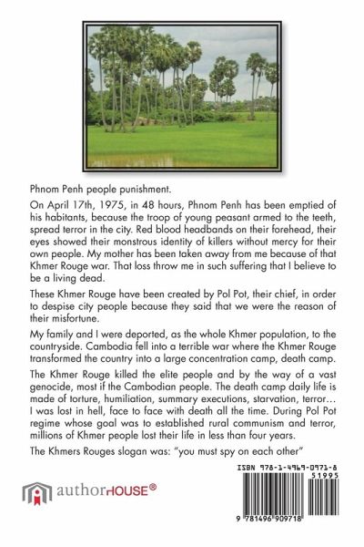 Phnom Penh people punishment. On April 17th, 1975, in 48 hours, Phnom Penh has been emptied of his habitants, because the troop of young peasant armed to the teeth, spread terror in the city. Red blood headbands on their forehead, their eyes showed their monstrous identity of killers without mercy for their own people. My mother has been taken away from me because of that Khmer Rouge war. That loss throw me in such suffering that I believe to be a living dead. These Khmer Rouge have been created by Pol Pot, their chief, in order to despise city people because they said that we were the reason of their misfortune. My family and I were deported, as the whole Khmer population, to the countryside. Cambodia fell into a terrible war where the Khmer Rouge transformed the country into a large concentration camp, death camp. The Khmer Rouge killed the elite people and by the way of a vast genocide, most if the Cambodian people. The death camp daily life is made of torture, humiliation, summary executions, starvation, terror... I was lost in hell, face to face with death all the time. During Pol Pot regime whose goal was to established rural communism and terror, millions of Khmer people lost their life in least than four years. The Khmer Rouge slogan was: "you must spy on each other"