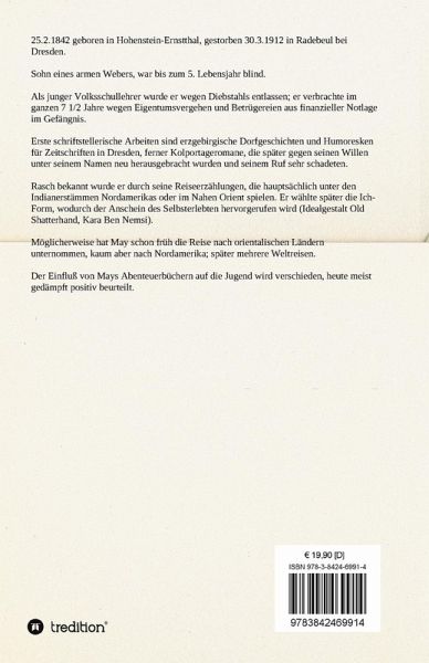 Karl May (1842-1912) war das fünfte von 14 Kindern einer armen Weberfamilie aus Ernstthal/Sachsen. Vom Studium am Lehrerseminar wurde er zunächst ausgeschlossen, nachdem er Kerzenreste unterschlagen hatte. Später konnte er die Ausbildung fortsetzen, arbeitete nur 14 Tage in seinem Beruf, bevor er wieder des Diebstahls bezichtigt und von der Liste der Kandidaten gestrichen wurde. Wegen Diebstahls, Betrugs und Hochstapelei wurde er in den Jahren darauf immer wieder verhaftet und monatelang festgesetzt. Die Jahre zwischen 1870 und 1874 verbrachte er im Zuchthaus Waldheim. Erst viele Jahre nach dem Erscheinen des akribisch recherchierten Orientzyklus reiste Karl May tatsächlich in den Orient. Karl May war lange Zeit einer der meistgelesenen deutschen Schriftsteller. Er starb1912 in Radebeul.