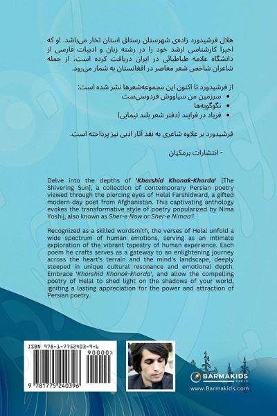 Delve into the depths of 'Khorshid Khonok-Khorda' [The Shivering Sun], a collection of contemporary Persian poetry viewed through the piercing lens of Helal Farshidward, a gifted modern-day poet from Afghanistan. This captivating anthology evokes the transformative style of poetry popularized by Nima Yoshij, also known as Sher-e Now or Sher-e Nimaa'i. Recognized as a skilled wordsmith, the verses of Helal unfold a wide spectrum of human emotions, serving as an intimate exploration of the vibrant tapestry of human experience. Each poem he crafts serves as a gateway to an enlightening journey across the heart's terrain and the mind's landscape, deeply steeped in unique cultural resonance and emotional depth. Embrace 'Khorshid Khonok-khorda', and allow the compelling poetry of Helal to shed light on the shadows of your world, igniting a lasting appreciation for the power and attraction of Persian poetry.