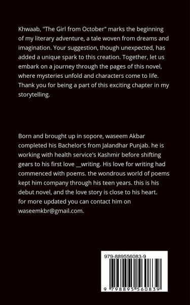 Khwaab, "The Girl from October" marks the beginning of my literary adventure, a tale woven from dreams and imagination. Your suggestion, though unexpected, has added a unique spark to this creation. Together, let us embark on a journey through the pages of this novel, where mysteries unfold and characters come to life. Thank you for being a part of this exciting chapter in my storytelling.