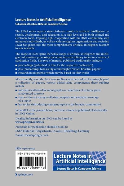 Session 1. Invited Talk.- Expressivity-Preserving Tempo Transformation for Music - A Case-Based Approach.- Session 2. Cognition and Emotion.- MicroPsi: Contributions to a Broad Architecture of Cognition.- Affective Cognitive Modeling for Autonomous Agents Based on Scherer's Emotion Theory.- Session 3A. Semantic Web.- OWL and Qualitative Reasoning Models.- Techniques for Fast Query Relaxation in Content-Based Recommender Systems.- Session 3B. Analogy.- Solving Proportional Analogies by E-Generalization.- Building Robots with Analogy-Based Anticipation.- Session 4A. Natural Language.- Classification of Skewed and Homogenous Document Corpora with Class-Based and Corpus-Based Keywords.- Learning an Ensemble of Semantic Parsers for Building Dialog-Based Natural Language Interfaces.- Session 4B. Reasoning.- Game-Theoretic Agent Programming in Golog Under Partial Observability.- Finding Models for Blocked 3-SAT Problems in Linear Time by Systematical Refinement of a Sub-model.- Towards the Computation of Stable Probabilistic Model Semantics.- DiaWOz-II - A Tool for Wizard-of-Oz Experiments in Mathematics.- Session 5. Invited Talk.- Applications of Automated Reasoning.- Session 6A. Ontologies.- On the Scalability of Description Logic Instance Retrieval.- Relation Instantiation for Ontology Population Using the Web.- Session 6B. Spatio-temporal Reasoning.- GeTS - A Specification Language for Geo-Temporal Notions.- Active Monte Carlo Recognition.- Session 7A. Machine Learning.- Cross System Personalization and Collaborative Filtering by Learning Manifold Alignments.- A Partitioning Method for Mixed Feature-Type Symbolic Data Using a Squared Euclidean Distance.- Session 7B. Spatial Reasoning.- On Generalizing Orientation Information in .- Towards the Visualisation ofShape Features The Scope Histogram.- Session 8A. Robot Learning.- A Robot Learns to Know People-First Contacts of a Robot.- Recombinant Rule Selection in Evolutionary Algorithm for Fuzzy Path Planner of Robot Soccer.- Session 8B. Classical AI Problems.- A Framework for Quasi-exact Optimization Using Relaxed Best-First Search.- Gray Box Robustness Testing of Rule Systems.- A Unifying Framework for Hybrid Planning and Scheduling.- Session 9. Agents.- A Hybrid Time Management Approach to Agent-Based Simulation.- Adaptive Multi-agent Programming in GTGolog.- Agent Logics as Program Logics: Grounding KARO.- On the Relationship Between Playing Rationally and Knowing How to Play: A Logical Account.- Special Event. 50 Years Artificial Intelligence.- 1956-1966 How Did It All Begin? - Issues Then and Now.- Fundamental Questions.- Towards the AI Summer.- History of AI in Germany and The Third Industrial Revolution.- Three Decades of Human Language Technology in Germany.- 1996-2006 Autonomous Robots.- Projects and Vision in Robotics.- What Will Happen in Algorithm Country?.