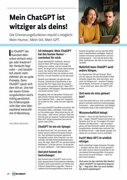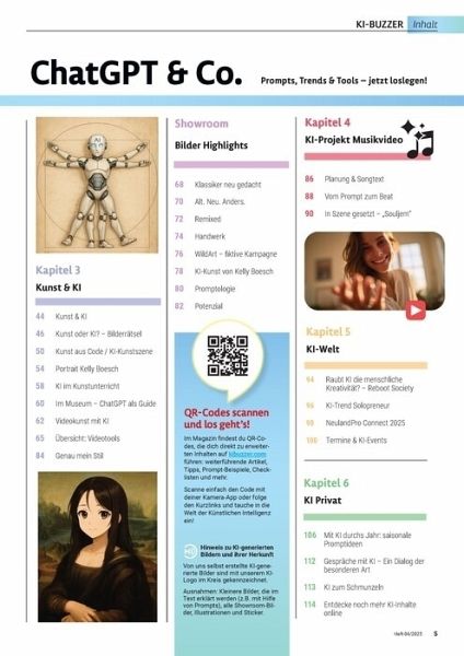 Dieses hochwertige Bookazine ist dein Wegweiser durch die aktuellen KI-Trends 2025 - verständlich, inspirierend und praxisnah. Erfahre, wie du mit Prompts gezielt mit ChatGPT arbeitest, wie du atemberaubende Bilder mit den neuesten Tools von ChatGPTerzeugst, und was es mit dem KI-Führerschein auf sich hat und wie Unternehmen und Mitarbeiter künftig damit umgehen.