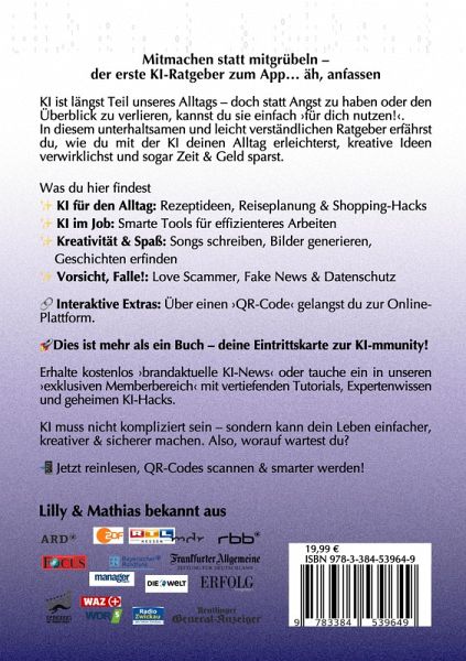Mitmachen statt mitgrübeln - der erste KI-Ratgeber zum App... äh, anfassenKI ist längst Teil unseres Alltags - doch statt Angst zu haben oder den Überblick zu verlieren, kannst du sie einfach 'für dich nutzen!'.In diesem unterhaltsamen und leicht verständlichen Ratgeber erfährst du, wie du mit der KI deinen Alltag erleichterst, kreative Ideen verwirklichst und sogar Zeit & Geld sparst.Was du hier findest KI für den Alltag: Rezeptideen, Reiseplanung & Shopping-Hacks KI im Job: Smarte Tools für effizienteres Arbeiten Kreativität & Spaß: Songs schreiben, Bilder generieren, Geschichten erfinden Vorsicht, Falle!: Love Scammer, Fake News & Datenschutz Interaktive Extras: Über einen 'QR-Code' gelangst du zur Online-Plattform. Dies ist mehr als ein Buch - deine Eintrittskarte zur KI-mmunity!Erhalte kostenlos 'brandaktuelle KI-News' oder tauche ein in unseren 'exklusiven Memberbereich' mit vertiefenden Tutorials, Expertenwissen und geheimen KI-Hacks. KI muss nicht kompliziert sein - sondern kann dein Leben einfacher, kreativer & sicherer machen. Also, worauf wartest du? Jetzt reinlesen, QR-Codes scannen & smarter werden!