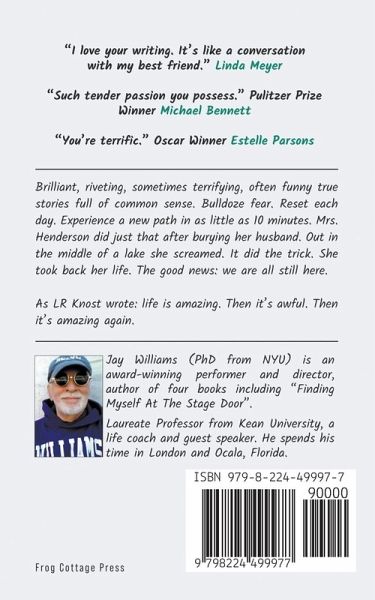 POWERFUL, riveting, sometimes terrifying, often funny true life "kick ass" stories to get you back on track and reclaim your JOY. Bulldoze fear. RESET each morning, experience change in as little as 10 minutes. Mrs. Henderson did just that. Having buried her husband, she rowed to the middle of a misty lake and screamed so loud that it echoed across the water. And with that action, she became fully alive again. LR Knost: "Life is amazing. Then it's awful. Then it's amazing again." GOOD NEWS: you have the power to pave a new path right now. Even better: YOU'RE STILL HERE. About Jay Williams...... "You're terrific." Oscar Winner Estelle Parsons "Such tender passion you possess." Pulitzer Prize winner Michael Bennett "I love the way you write,. It's like a conversartion with my best friend." Linda Meyer