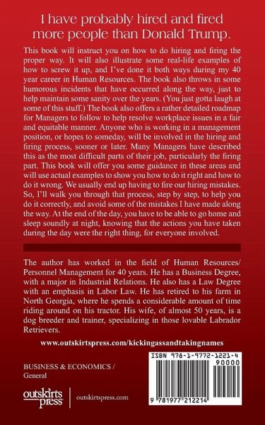 This book will instruct you on how to do hiring and firing the proper way. It will also illustrate some real-life examples of how to screw it up, and I've done it both ways during my 40 year career in Human Resources. The book also throws in some humorous incidents that have occurred along the way, just to help maintain some sanity over the years. (You just gotta laugh at some of this stuff.) The book also offers a rather detailed roadmap for Managers to follow to help resolve workplace issues in a fair and equitable manner. Anyone who is working in a management position, or hopes to someday, will be involved in the hiring and firing process, sooner or later. Many Managers have described this as the most difficult parts of their job, particularly the firing part. This book will offer you some guidance in these areas and will use actual examples to show you how to do it right and how to do it wrong. We usually end up having to fire our hiring mistakes. So, I'll walk you through that process, step by step, to help you do it correctly, and avoid some of the mistakes I have made along the way. At the end of the day, you have to be able to go home and sleep soundly at night, knowing that the actions you have taken during the day were the right thing, for everyone involved.