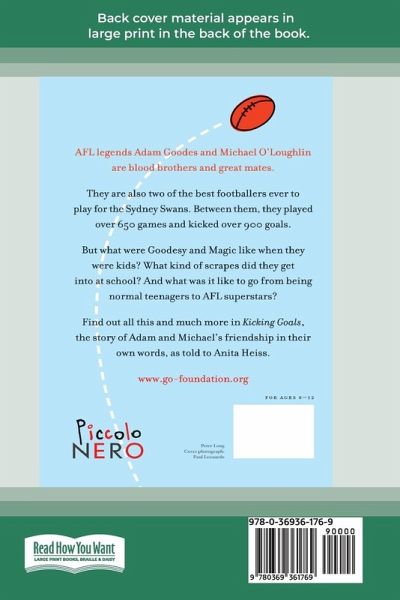 AFL legends Adam Goodes and Michael O'Loughlin are blood brothers and great mates. They are also two of the best footballers ever to play for the Sydney Swans. Between them, they played over 650 games and kicked over 900 goals. But what were Goodesy and Magic like when they were kids? What kind of scrapes did they get into at school? And what was it like to go from being normal teenagers to AFL superstars? Find out all this and much more in Kicking Goals, the story of Adam and Michael's friendship in their own words, as told to Anita Heiss.