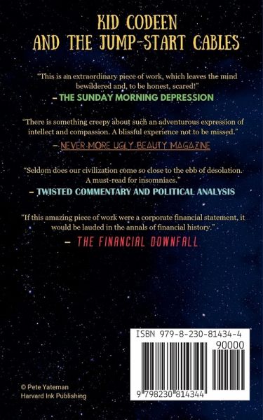 Cue the opening reel...a small-town movie theater, shadowy figures sneaking in through the velvet-clad back row. As it rolls across the screen, the story yanks you into its pages, where absurdity unfolds..and then spits you out at the end of the ride, leaving you looking on as your story friends walk off into their reality, leaving you in yours... "Expect the unexpected. This is NOT the Spanish Inquisition, but it does look suspiciously red-frocked..." - The Sunday Review. "We do not recommend you read this book without a stiff whisky and a special kind of smoke..." - Women's Institute Weekly. "A refreshing nod at real words in a sensible yet totally unexpected order on the page. And there I thought good writing was a dead art." - Sir Gerald de Bardot and his pet prawn, Simon. Saunter casually past the world of Kid Codeen and the Jumpstart Cables, whistling nonchalantly so nobody thinks you're up to no good. A ramshackle workshop and an engine block perched on a stack of stolen blue bricks becomes the least baffling thing you'll notice. Kid Codeen, Pig le Penn, and their hapless entourage of small-town misfits-including Meat-Head Harry (who suffers from a serious case of Inverted Intelectio Paralysis and can't work a bandsaw), Larry the Lounge Lizard (a gambling machine's worst nightmare), and Bullshit Barry (whose tales stretch taller than a giraffe on stilts)-navigate a series of increasingly absurd misadventures. There's a funeral parlor marketing "virtual life-after-death experiences," an unexpected resurrection, and the peculiar and particular mystery of a wall missing its top right corner. And that's just the bits that stick out. Will the crew ever fix the old truck? Will the bricks come back to haunt them? And why does everyone trust Johnny Fleetfoot, a blind poker player who mysteriously always wins every game, and whose dog wears sunglasses and drinks beer? Part absurdist farce, part philosophical ramble, and entirely ridiculous, this is a story of camaraderie, chaos, and the inexplicable logic of small-town life. So grab your whiskey, light a smoke, and settle in. But remember-whatever happens, never leave the shed door open. "Imagine Quentin Tarantino wrote a comedy...This book is not at all silly, except on Fridays ..." - Mrs Codeen. on a Tuesday.