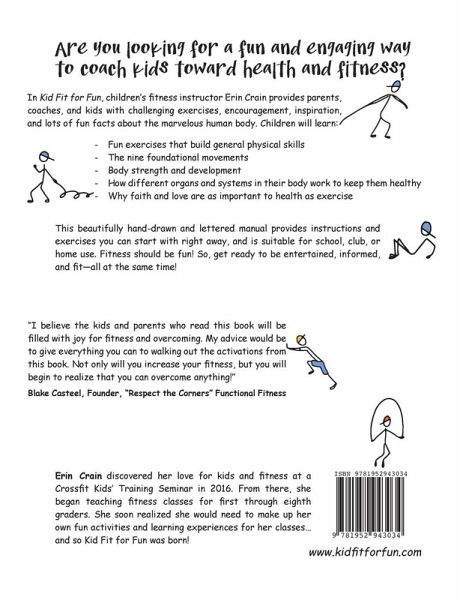 In Kid Fit for Fun, children's fitness instructor Erin Crain provides parents, coaches, and kids with challenging exercises, encouragement, inspiration, and lots of fun facts about the marvelous human body. Children will learn: - Fun exercises that build general physical skills - The nine foundational movements - Body strength and development - How different organs and systems in their body work to keep them healthy - Why faith and love are as important to health as exercise This beautifully hand-drawn and lettered manual provides instructions and exercises you can start with right away, and is suitable for school, club, or home use. Fitness should be fun! So, get ready to be entertained, informed, and fit-all at the same time!