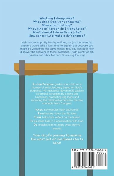 What am I doing here? What does God want from me? Where do I belong? What do I do with my life? How can my life make a difference? Kids ask some pretty hard questions, not just because the answers would take a long time to explain, but because you might be wondering the same things, too. You can both now discover the answers to these questions together--with plenty of art, puzzles and other fun activities along the way. Kid on Purpose tackles some of life's biggest questions through 40 theologically-grounded devotionals spread across 150+ pages with full-color illustrations. 20+ interactive activities based on human development, personal growth and mental health principles challenge you and your child to actively engage in nurturing your young one's spiritual formation. Each devotional focuses on a Big Question, presents a Big Idea and explores the relationship between the two concepts from 5 angles: "Know" summarizes each devotional; "Read" breaks down the Big Idea; "Think" challenges kids to reflect on the lesson; "Pray" leads kids in a conversation with God; "Do" enables kids to apply what they've learned. Your child's journey to making the most of their childhood starts here!
