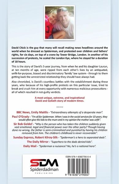 David Chick is the guy that many will recall making news headlines around the world when he dressed as Spiderman, and protested over children and fathers' rights, for six days, on top of a crane by Tower Bridge, London. In another of his succession of protests, he scaled the London Eye, where he stayed for a duration of 18 hours. This is the story of David's 5-year journey, from when he and his daughter Lauryn, at ten months of age, were ripped from each other's lives by an antiquated, unfit-for-purpose, biased and discriminatory 'family' law system - through to them getting back the unrestricted relationship they should have always had. Also chronicled, is David's countless battles with the establishment during these years, who because of his high-profile protests on this particular issue, tried to break and crush him at every opportunity with numerous malicious prosecutions - all of which resulted in not-guilty verdicts. A most unique, extreme, and inspirational David and Goliath story of modern times. ...... BBC News, Emily Maitlis - "Extraordinary attempts of a desperate man". Paul O'Grady - "I'm all for Spiderman. When I was in the social services for 10 years, they would often give the kids to the mum and in my opinion the mother was unfit". Sir Bob Geldof - "Why is the person who has taken the children suddenly given vast emotional, legal and financial power over the other party? Though having done no wrong, the father is semi-criminalised and punished by having his children removed from him. The children's childhood is never recoverable". Sunday Express, Robert Kilroy-Silk - "Spiderman's a hero to separated dads". The Daily Mirror - "Superhero to the dads denied kids". Daily Mail - "Spiderman a nuisance? No, he's a national hero".