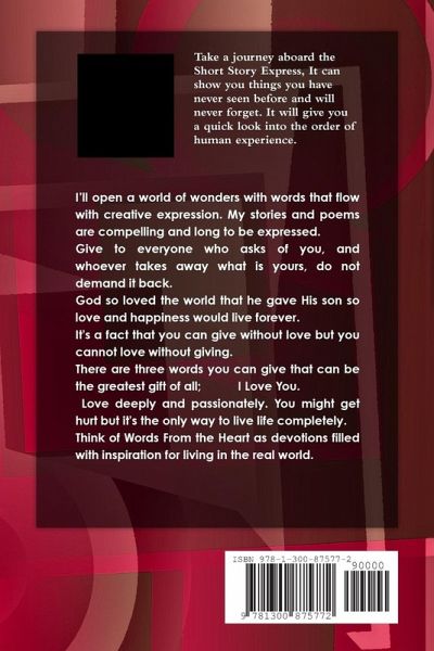 I'll open a world of wonders with words that flow with creative expression. My stories and poems are compelling and long to be expressed and I love writing for kids Give to everyone who asks of you, and whoever takes away what is yours, do not demand it back. God so loved the world that he gave His son so love and happiness would live forever. It's a fact that you can give without love but you cannot love without giving. There are three words you can give that can be the greatest gift of all; I Love You. Love deeply and passionately. You might get hurt but it's the only way to live life completely. Think of Words From the Heart as devotions filled with inspiration for living in the real world.