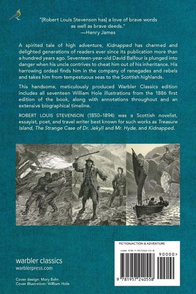 A spirited tale of high adventure, Kidnapped has charmed and delighted generations of readers ever since its publication more than a hundred years ago. Seventeen-year-old David Balfour is plunged into danger when his uncle contrives to cheat him out of his inheritance. His harrowing ordeal finds him in the company of renegades and rebels and takes him from tempestuous seas to the Scottish highlands. This handsome, meticulously produced Warbler Classics edition includes all seventeen William Hole illustrations from the 1886 first edition of the book, along with annotations throughout and an extensive biographical timeline.