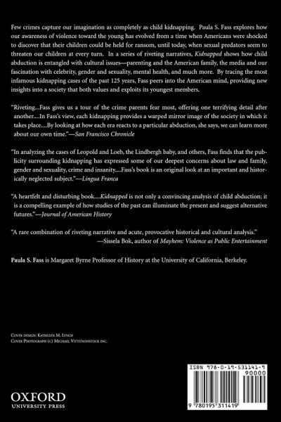 Few crimes capture our imagination as completely as child kidnapping. Paula S. Fass explores how our awareness of violence toward the young has evolved from a time when Americans were shocked to discover that their children could be held for ransom, until today, when sexual predators seem to threaten our children at every turn. In a series of riveting narratives, Kidnapped shows how child abduction is entangled with cultural issues -- parenting and the American family, the media and our fascination with celebrity, gender and sexuality, mental health, and much more. By tracing the most infamous kidnapping cases of the past 125 years, Fass peers into the American mind, providing new insights into a society that both values and exploits its youngest members.