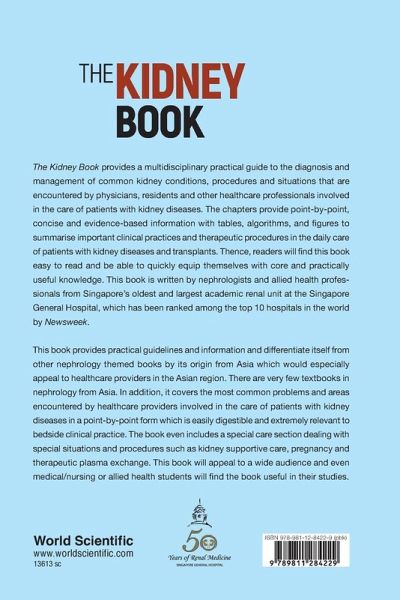 The Kidney Book provides a multidisciplinary practical guide to the diagnosis and management of common kidney conditions, procedures and situations that are encountered by physicians, residents and other healthcare professionals involved in the care of patients with kidney diseases. The chapters provide point-by-point, concise and evidence-based information with tables, algorithms, and figures to summarise important clinical practices and therapeutic procedures in the daily care of patients with kidney diseases and transplants. Thence, readers will find this book easy to read and be able to quickly equip themselves with core and practically useful knowledge. This book is written by nephrologists and allied health professionals from Singapore's oldest and largest academic renal unit at the Singapore General Hospital, which has been ranked among the top 10 hospitals in the world by Newsweek. This book provides practical guidelines and information and differentiate itself from other nephrology themed books by its origin from Asia which would especially appeal to healthcare providers in the Asian region. There are very few textbooks in nephrology from Asia. In addition, it covers the most common problems and areas encountered by healthcare providers involved in the care of patients with kidney diseases in a point-by-point form which is easily digestible and extremely relevant to bedside clinical practice. The book even includes a special care section dealing with special situations and procedures such as kidney supportive care, pregnancy and therapeutic plasma exchange. This book will appeal to a wide audience and even medical/nursing or allied health students will find the book useful in their studies.