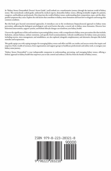 In "Kidney Stones Demystified: Doctor's Secret Guide," you'll embark on a transformative journey through the intricate world of kidney stones. This meticulously crafted guide, authored by medical experts, demystifies kidney stones, offering invaluable insights for patients, caregivers, and healthcare professionals. Dive deep into the world of kidney stones, understanding their composition, types, and the often-painful symptoms they cause. Explore the risk factors that contribute to kidney stone formation and learn how to diagnose and manage this common condition. But this book goes beyond conventional approaches. It introduces you to the revolutionary biopsychosocial approach to kidney stone prevention, addressing the biological, psychological, and social factors that play a crucial role in kidney stone formation. Discover how behavioral interventions, support systems, and holistic lifestyle changes can transform your kidney health. Uncover the significance of diet and nutrition in preventing kidney stones, with a comprehensive kidney stone prevention diet that includes hydration, calcium balance, sodium restriction, and specific food recommendations. Lifestyle modifications for kidney stone prevention, including exercise, stress management, and mindfulness, are also explored, alongside complementary and alternative therapies like herbal remedies and acupuncture. This guide equips you with coping strategies for managing kidney stones and offers real-life case studies and success stories that inspire and empower. Find a wealth of resources, from organizations and support groups to healthcare professionals and online tools, to navigate your kidney stone journey. "Kidney Stones Demystified" is your indispensable companion in understanding, preventing, and managing kidney stones, offering a holistic approach to kidney health that empowers you to take control and embrace a life free from the burden of kidney stones.