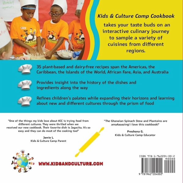 Kids & Culture Camp Cookbook:Vegan Cuisines from Around the World takes your taste buds on an interactive culinary journey to sample a variety of cuisines from different regions. Similar to Kids & Culture Camp's programming, where all learning is experiential, the healthy recipes in the cookbook teach children about a variety of culturally significant dishes and ingredients by describing foods that are typical in different regions and encouraging children to prepare and consume the dishes themselves. Written by Jania Otey, an inspiring author-educator, vegan cook, and the founder of Kids & Culture Camp, the 35 plant-based and dairy-free recipes in this cookbook span the Americas, the Caribbean, the Islands of the World, African Fare, Asia, and Australia. The cookbook itself appeals to a wide range of audiences and fits in well with a variety of dietary preferences. Yet, young chefs will enjoy having their very own kids cookbook that features pictures of children from Kids & Culture Camp. The educational component of this recipe book is also artfully and subtly communicated. The food styling and photography are bright and evocative, and the recipes are all beloved by the children, parents, and instructors at Kids & Culture Camp. The recipes are written in a way that is very accessible to cooks with varying levels of experience. All of the recipes can be made by children with adult supervision, just as they are made by the children who attend Kids & Culture Camp. The measurements are simple and straightforward; only basic kitchen equipment is required, and the instructions are clear so that home cooks with limited culinary skills, vocabulary, and experience can understand them. The recipes are very flexible and forgiving, and the ingredients can easily be adapted to suit different tastes and dietary needs. Adding this cookbook to your children's book collection will inspire them to develop an appreciation for learning about cultures and countries from around the world. Children who participate in the preparation of their own meals are more inclined to eat what they have made. By preparing the recipes presented in Kids & Culture Camp's Cookbook, children are given the opportunity to refine their palates while expanding their horizons and learn about new and different cultures through the prism of food. Having healthy cookbooks at your child's fingertips can help prevent obesity and promote mindfulness. Kids & Culture Camp Cookbook offers not only a collection of delicious recipes, it also embodies the philosophy of nurturing global citizens and gives readers a taste of what the campers learn and do through the programming that is offered and the food that unites them.