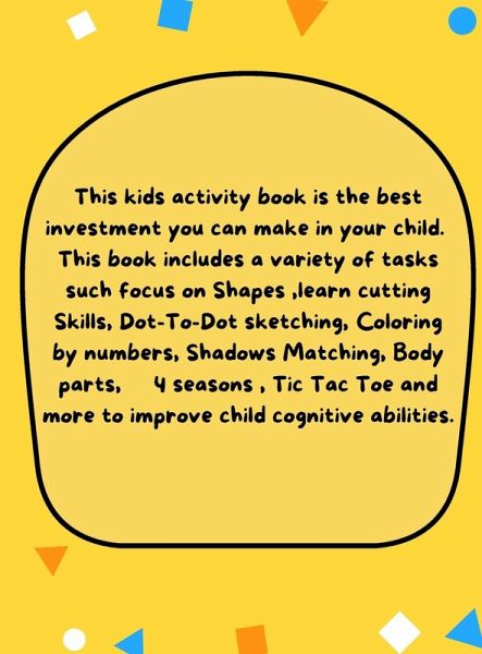 This kids activity book is the best investment you can make in your child.This book includes a variety of tasks such as Focus on Shapes ,Learn Cutting Skills, Dot-To-Dot sketching, Coloring By Numbers, Shadows Matching, Body Parts, 4 seasons , Tic Tac Toe and more to improve child cognitive abilities.