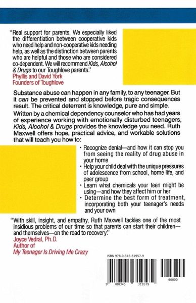 EVERYTHING YOU NEED TO KNOW TO PREVENT YOUR CHILD FROM GETTING HOOKED-AND HOW TO HELP ONE WHO ALREADY IS Substance abuse can happen in any family, to any teenager. But it can be prevented and stopped before tragic consequences result. The critical deterrent is knowledge, pure and simple. Written by a chemical dependency counselor who has had years of experience working with emotionally disturbed teenagers, Kids, Alcohol & Drugs provides the knowledge you need. Ruth Maxwell offers hope, practical advice, and workable solutions that will teach you how to: • Recognize denial-and how it can stop you from seeing the reality of drug abuse in your home • Help your child deal with the unique pressures of adolescence from school, home life, and peer group • Learn what chemicals your teen might be using-and how they affect him or her • Determine the best form of treatment, incorporating both your teenager's needs and your own "Real support for parents. We especially liked the differentiation between cooperative kids who need help and non-cooperative kids needing help, as well as the distinction between parents who are helpful and those who are considered co-dependent. We will recommend Kids, Alcohol & Drugs to our Toughlove parents."-Phyllis and David York, founders of Toughlove "With skill, insight, and empathy, Ruth Maxwell tackles one of the most insidious problems of our time so that parents can start their children-and themselves-on the road to recovery."-Joyce Vedral, Ph.D., author of My Teenager Is Driving Me Crazy