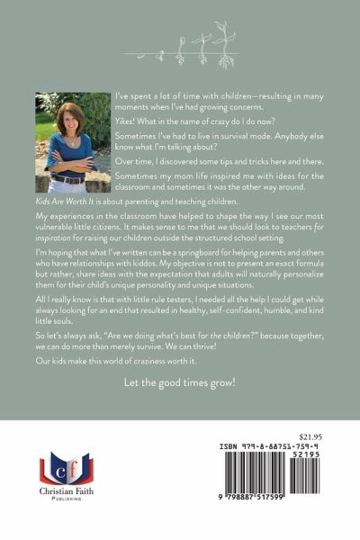 I've spent a lot of time with children--resulting in many moments when I've had growing concerns. Yikes! What in the name of crazy do I do now? Sometimes I've had to live in survival mode. Anybody else know what I'm talking about? Over time, I discovered some tips and tricks here and there. Sometimes my mom life inspired me with ideas for the classroom and sometimes it was the other way around. Kids Are Worth It is about parenting and teaching children. My experiences in the classroom have helped to shape the way I see our most vulnerable little citizens. It makes sense to me that we should look to teachers for inspiration for raising our children outside the structured school setting. I'm hoping that what I've written can be a springboard for helping parents and others who have relationships with kiddos. My objective is not to present an exact formula but rather, share ideas with the expectation that adults will naturally personalize them for their child's unique personality and unique situations. All I really know is that with little rule testers, I needed all the help I could get while always looking for an end that resulted in healthy, self-confident, humble, and kind little souls. So let's always ask, "Are we doing what's best for the children?" because together, we can do more than merely survive. We can thrive! Our kids make this world of craziness worth it. Let the good times grow!