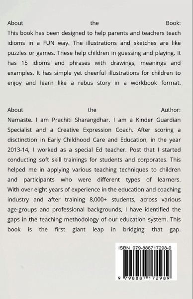 This book has been designed to help parents and teachers teach idioms in a FUN way. The illustrations and sketches are like puzzles or games. These help children in guessing and playing. It has 15 idioms and phrases with drawings, meanings and examples. It has simple yet cheerful illustrations for children to enjoy and learn like a rebus story in a workbook format.