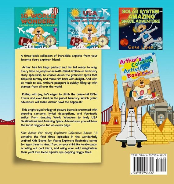 He has a nose for the greatest adventures. What marvelous treasures will this dog lap up next? A three-book collection of incredible exploits from your favorite furry explorer friend! Arthur has his bags packed and his tail ready to wag. Every time he jumps on a swift-tailed airplane or his trusty shiny spaceship, he chases down the grandest spots that tickle his tummy and make him bark with delight. And with so much to see, Arthur's passport is quickly filling up with stamps from all over the world. Rolling with joy, he's eager to climb the crazy-tall Eiffel Tower and even land on the planet Mercury. Which grand adventure will make Arthur howl the happiest? This bright-eyed trilogy of picture books is crammed with stunning cartoons, lyrical descriptions, and fun-tastic antics. From dazzling World Wonders to lively USA Destinations and Amazing Space Adventures, you will have the most doggone fun on every page. Kids Books For Young Explorers Collection: Books 1-3 contains the first three episodes in the wonderfully crafted Kids Books for Young Explorers illustrated series for ages three to nine. If you or your child like lovable pups, scouting out cool facts, and using your wild imagination, then you'll love Gene Lipen's eye-popping doggy tales. Buy Kids Books For Young Explorers Collection to jump into a joyful journey today!
