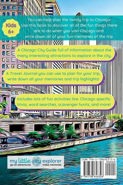 ¿ Make the most of your family's visit to Chicago by getting the kids involved! ¿ With this Chicago Kid's City Guide & Journal, kids 6+ can learn interesting facts about Chicago, explore fun places to go on your visit, and journal about their adventures.Chicago City Guide - Kids can learn fun facts about Chicago (like how it got it's name) and read about fun places to visit (like Millennium Park, Field Museum, Chicago Children's Museum, Lincoln Park Zoo, and more). Travel Journal - With pages to record trip details, journaling pages, pages to doodle, and pages to keep tickets and other souvenirs, kids can record their adventures exploring different parts of the city. Makes for a great keepsake! Activities - There are lots of fun activities found throughout the book to keep kids entertained - with word searches, scavenger hunts, Chicago specific trivia, and more! Find out more about my little city explorer and the other Kid's City Guides & Journals that we offer at: www.mylittlecityexplorer.com. We also have links to city resources to help with your travel plans!