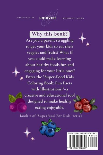 Discover the Exciting World of Superfoods Through Creative Exploration! "Kids Coloring Book Superfood: Get To Know Some Interesting Facts While Coloring!" is an engaging blend of creativity and education, designed to captivate young minds with vibrant illustrations and intriguing facts about superfoods. Each page features bold outlines for coloring and fascinating tidbits that spark curiosity, making learning about nutrition a delightful adventure.Why Choose This Coloring Book?Authentic Learning Experience Unlike traditional educational methods, this coloring book invites children to learn through play and discovery. By exploring colorful illustrations of superfoods like nutrient-packed spinach and antioxidant-rich berries, children not only enjoy the creative process of coloring but also absorb valuable knowledge about healthy eating. Beyond Conventional Wisdom This book goes beyond typical learning by integrating facts about superfoods in a format that resonates with children's natural curiosity and imagination. Each illustration is a gateway to discussions about nutrition, encouraging children to think critically about their food choices in a way that feels engaging and empowering. Cognitive Development and Engagement Ideal for homeschooling or classroom settings, "Kids Coloring Book Superfood" enhances cognitive development through interactive activities. Coloring activities stimulate fine motor skills and hand-eye coordination, while educational content promotes early literacy and numeracy in a meaningful context. Empowering Healthy Habits As children color and learn about the benefits of superfoods like vibrant carrots and protein-packed beans, they are inspired to incorporate these nutritious foods into their diets. This empowerment not only cultivates healthy eating habits from a young age but also instills a lifelong appreciation for wholesome nutrition. Perfect for Home and School Whether used at home for family bonding or in educational environments, this coloring book enriches learning experiences. It supports educational goals related to health and nutrition, fostering positive attitudes toward food and well-being. Benefits of "Kids Coloring Book Superfood":Educational Fun: Engages children with fascinating facts about superfoods while they enjoy the creative process of coloring. Promotes Creativity: Encourages artistic expression and imaginative thinking through colorful illustrations of nutritious foods. Supports Healthy Choices: Empowers children to make informed decisions about their diets, promoting a balanced and nutritious lifestyle. Embrace the Joy of Learning Through Play "Kids Coloring Book Superfood: Get To Know Some Interesting Facts While Coloring!" is not just a coloring book-it's a gateway to healthier habits and a deeper understanding of nutrition. Nurture your child's curiosity and creativity with this educational tool that makes learning about superfoods as enjoyable as it is enlightening. Join the Coloring Adventure Today Make every coloring session an opportunity for discovery and growth. Order your copy now and watch as children embark on a colorful journey to better health and well-being-one superfood at a time.