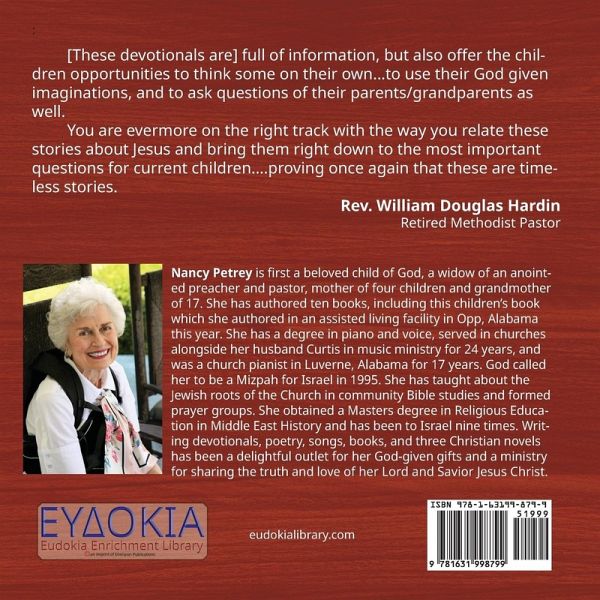 Perhaps the most important way a parent can have an impact on their child's spiritual life is by spending time with them reading about spiritual things. It's beneficial to both mind and spirit, while drawing parent and child closer. Nancy Petrey is a writer and a grandmother of 17. In this book she draws treasures from her store of biblical knowledge and personal experience to provide an opportunity for parents and children to read and learn together. While written for children, the stories and lessons are deep and serious. The enemy of our souls goes after those who are the most vulnerable, seeking to destroy God's plan for happy families whose priority is to glorify God and advance His kingdom as we await the return of our Lord and Messiah Jesus. These devotionals make good weapons against the enemy's attacks by arming the children with God's truth and love from His Word. The book was written primarily for children, ages 8 to 11. It is to be read by parents or grandparents to their child/children, or the child could read it in their presence. It contains 18 devotionals, 76 pages, and Memory Verses. The questions at the end of each devotional are designed for educational and spiritual growth. These devotionals will be helpful to any parent, and are a good tool for use in homeschooling.