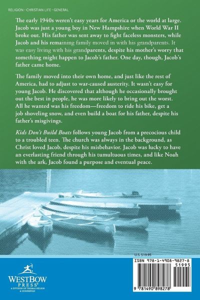 The early 1940s weren’t easy years for America or the world at large. Jacob was just a young boy in New Hampshire when World War II broke out. His father was sent away to fight faceless monsters, while Jacob and his remaining family moved in with his grandparents. It was easy living with his grandparents, despite his mother’s worry that something might happen to Jacob’s father. One day, though, Jacob’s father came home. The family moved into their own home, and just like the rest of America, had to adjust to war-caused austerity. It wasn’t easy for young Jacob. He discovered that although he occasionally brought out the best in people, he was more likely to bring out the worst. All he wanted was his freedom—freedom to ride his bike, get a job shoveling snow, and even build a boat for his father, despite his father’s misgivings. Kids Don’t Build Boats follows young Jacob from a precocious child to a troubled teen. The church was always in the background, as Christ loved Jacob, despite his misbehavior. Jacob was lucky to have an everlasting friend through his tumultuous times, and like Noah with the ark, Jacob found a purpose and eventual peace.