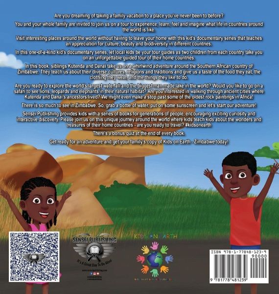 You and your whole family are invited to join us on a tour to experience, learn, feel, and imagine what life in countries around the world is like. Visit interesting places around the world without having to leave your home with this kid's documentary series teaches an appreciation for culture, beauty, and biodiversity in different countries. In this one-of-a-kind kid's documentary series, let local kids be your tour guides as two children from each country take you on an unforgettable guided tour of their home countries. In this book, siblings Kutenda and Danai take us on a whirlwind adventure around the Southern African country of Zimbabwe. They teach us about their diverse cultures, religions, and traditions and give us a taste of the food they eat, the clothing they wear, and the things they like to do. Are you ready to explore the world's largest waterfall and the biggest man-made lake in the world? Would you like to go on a safari to see lions, leopards, and elephants in their natural habitat? Are you interested in walking through ancient cities where Kutenda and Danai's ancestors lived? We might even make a stop past some of the oldest rock paintings in Africa! There is so much to see in Zimbabwe. So, grab a bottle of water, put on some sunscreen, and let's start our adventure! Sensei Publishing provides kids with a series of books for generations of people, encouraging exciting curiosity and interactive discovery. Please join us on this unique journey around the world where kids teach kids about the wonders and treasures of their home countries - are you ready to travel? #kidsonearth There's a bonus quiz at the end of every book. Get ready for an adventure and get your family's copy of Kids on Earth - Zimbabwe today!