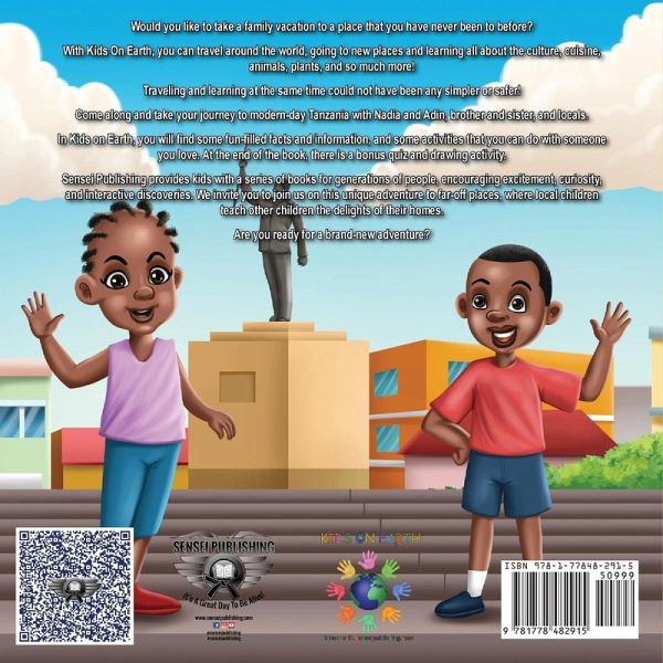 Would you like to take a family vacation to a place that you have never been to before? With Kids On Earth, you can travel around the world, going to new places and learning all about the culture, cuisine, animals, plants, and so much more! Traveling and learning at the same time could not have been any simpler or safer! Come along and take your journey to modern-day Tanzania with Nadia and Adin, brother and sister, and locals. In Kids on Earth, you will find some fun-filled facts and information, and some activities that you can do with someone you love. At the end of the book, there is a bonus quiz and drawing activity. Sensei Publishing provides kids with a series of books for generations of people, encouraging excitement, curiosity, and interactive discoveries. We invite you to join us on this unique adventure to far-off places, where local children teach other children the delights of their homes. Are you ready for a brand-new adventure?