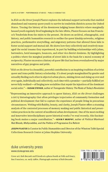 In Kids on the Street Joseph Plaster explores the informal support networks that enabled abandoned and runaway queer youth to survive in tenderloin districts across the United States. Tracing the history of the downtown lodging house districts where marginally housed youth regularly lived beginning in the late 1800s, Plaster focuses on San Francisco's Tenderloin from the 1950s to the present. He draws on archival, ethnographic, oral history, and public humanities research to outline the queer kinship networks, religious practices, performative storytelling, and migratory patterns that allowed these kids to foster social support and mutual aid. He shows how they collectively and creatively managed the social trauma they experienced, in part by building relationships with johns, bartenders, hotel managers, bouncers, and other vice district denizens. By highlighting a politics where the marginal position of street kids is the basis for a moral economy of reciprocity, Plaster excavates a history of queer life that has been overshadowed by major narratives of gay progress and pride.