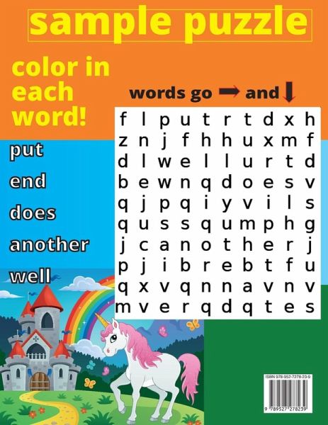 Welcome to the ultimate word search puzzle book for kids aged 5-8! With over 50 large print puzzles, this book is the perfect way to challenge your child's mind while keeping them entertained for hours on end. Featuring the most commonly used words in schoolbooks for this age range, your child will be able to build their vocabulary and reinforce their learning while having fun coloring in each word after they find it. And with all letters in lower case to reduce confusion, your child can focus on the puzzle-solving fun without getting tripped up by unfamiliar capital letters. This large-print book is presented in a large size, with one puzzle per page, so your child will be able to enjoy the challenge without any distractions. The cute unicorn figures on each page will keep them company as they search for words, and they'll love coloring them in too! Plus, with all solutions clearly marked at the end of the book, your child can check their work and celebrate their success. With a high quality glossy cover and thick 8.5" x 11" sized pages, this book is built to last and will provide your child with hours of entertainment and learning. So why not unplug your child and give them the gift of fun and education with this exciting word search puzzle book? Check out the sample puzzle on the back cover and get ready for hours of puzzling fun!