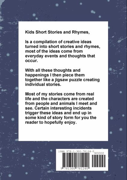 Kids Short Stories and Rhymes, Is a compilation of creative ideas turned into short stories and rhymes, most of the ideas come from everyday events and thoughts that occur. With all these thoughts and happenings I then piece them together like a jigsaw puzzle creating individual stories. Most of my stories come from real life and the characters are created from people and animals I meet and see. Certain interesting incidents trigger these ideas and end up in some kind of story form for you the reader to hopefully enjoy.