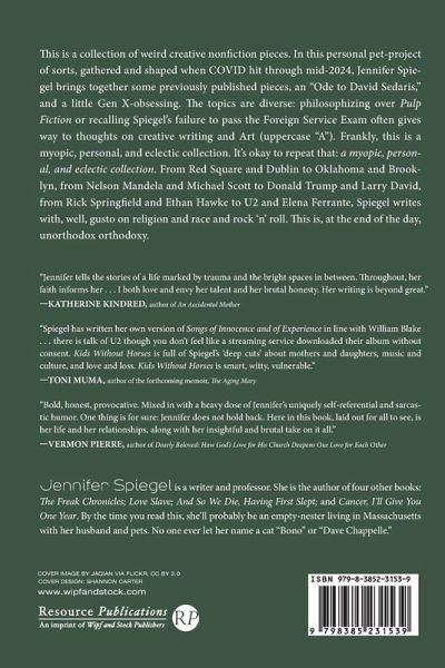 This is a collection of weird creative nonfiction pieces. In this personal pet-project of sorts, gathered and shaped when COVID hit through mid-2024, Jennifer Spiegel brings together some previously published pieces, an ""Ode to David Sedaris,"" and a little Gen X-obsessing. The topics are diverse: philosophizing over Pulp Fiction or recalling Spiegel's failure to pass the Foreign Service Exam often gives way to thoughts on creative writing and Art (uppercase ""A""). Frankly, this is a myopic, personal, and eclectic collection. It's okay to repeat that: a myopic, personal, and eclectic collection. From Red Square and Dublin to Oklahoma and Brooklyn, from Nelson Mandela and Michael Scott to Donald Trump and Larry David, from Rick Springfield and Ethan Hawke to U2 and Elena Ferrante, Spiegel writes with, well, gusto on religion and race and rock 'n' roll. This is, at the end of the day, unorthodox orthodoxy.